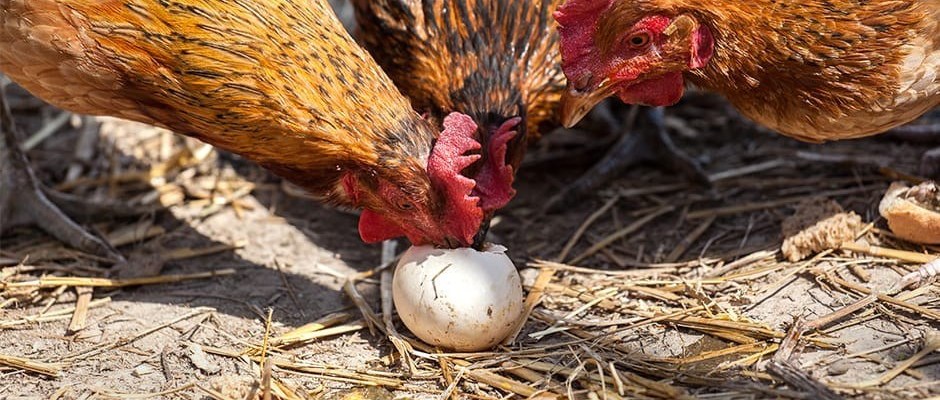 La première cause est une carence alimentaire. Une poule qui manque de calcium et/ou de protéines se mettra instinctivement à rechercher les protéines dans du jaune d’oeuf et du calcium avec la coquille. Si votre poule mange ses oeufs – ou ceux de ses compagnes – tous les jours, il faut peut-être revoir l’alimentation. Offrez un aliment riche en protéines et calcium, offrez des insectes et des coquilles d’huîtres broyées. C’est d’autant plus important au printemps, qui est la saison de reproduction où les poules pondent le plus.