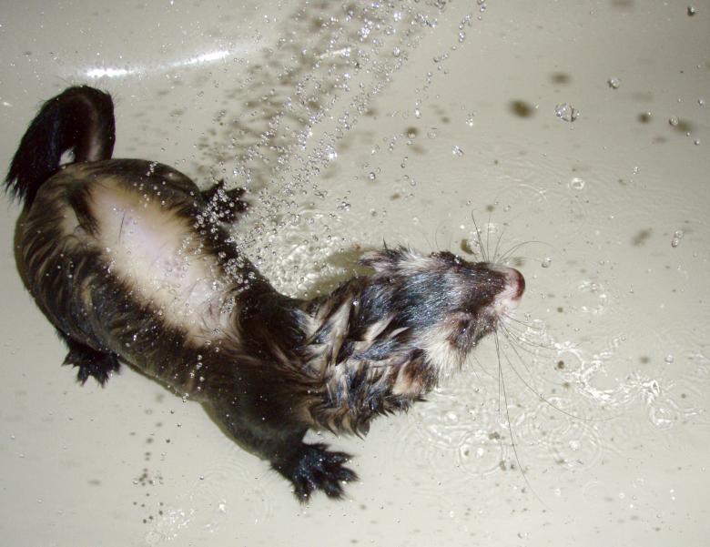 L’odeur musquée du furet, qui devient d’autant plus forte en période de reproduction, peut parfois chatouiller les narines de leurs « parents »… La tentation de baigner son animal est alors très présente ! Pourtant, c’est loin d’être une bonne idée !